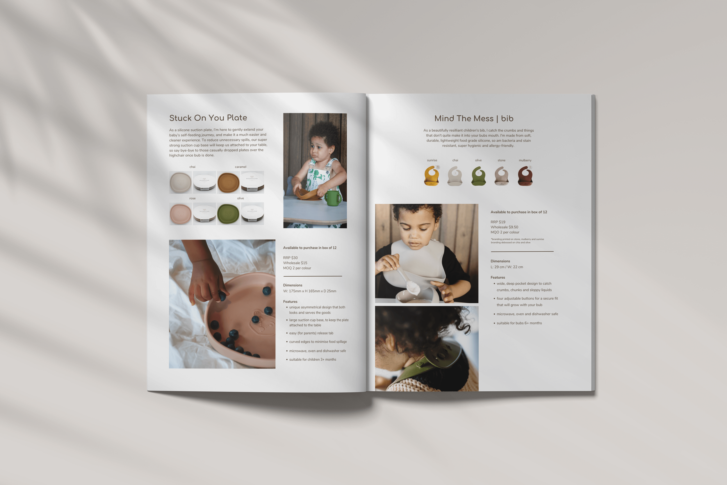 The 2024/2025 wholesale and retail catalogues for Bareware Bub were designed to showcase their range of children’s products with clarity and consistency. Working with their existing branding, we refined the layout to strengthen design cohesion and follow best practice principles. The result is a pair of catalogues that balance visual appeal with easy navigation, supporting both retail customers and wholesale partners in exploring the brand’s offering.
